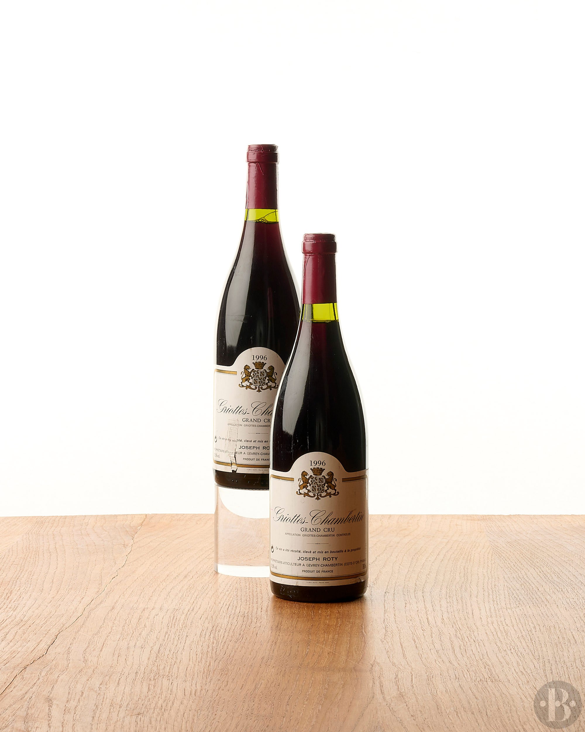 Creased capsules and one slightly scratched. Very slightly bin-soiled labels, stained and one torn label. Levels at 1,3cm and 1,6cm below base of capsule.