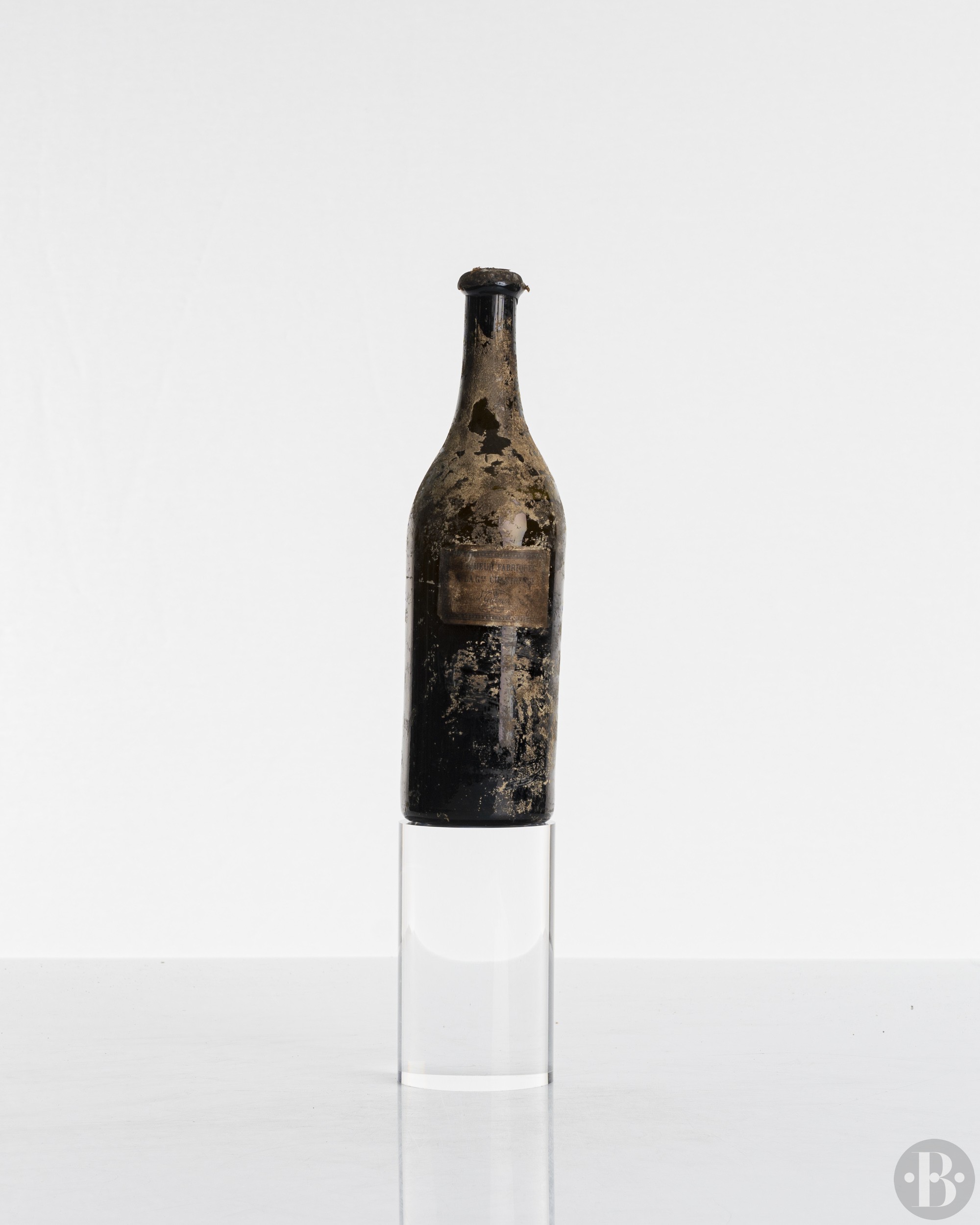 Believed "Jaune". Provenance: Italy. Thick handblown glass, very dark. Good wax capsule. Remains of pastille on the top with Chartreux stamp (globe + cross). Through the thick glass, one can discern a good cork, in place. Very bin-soiled label, legible, with the single 'L. Garnier' signature at its very center. Level at 10cms below base of cork.
