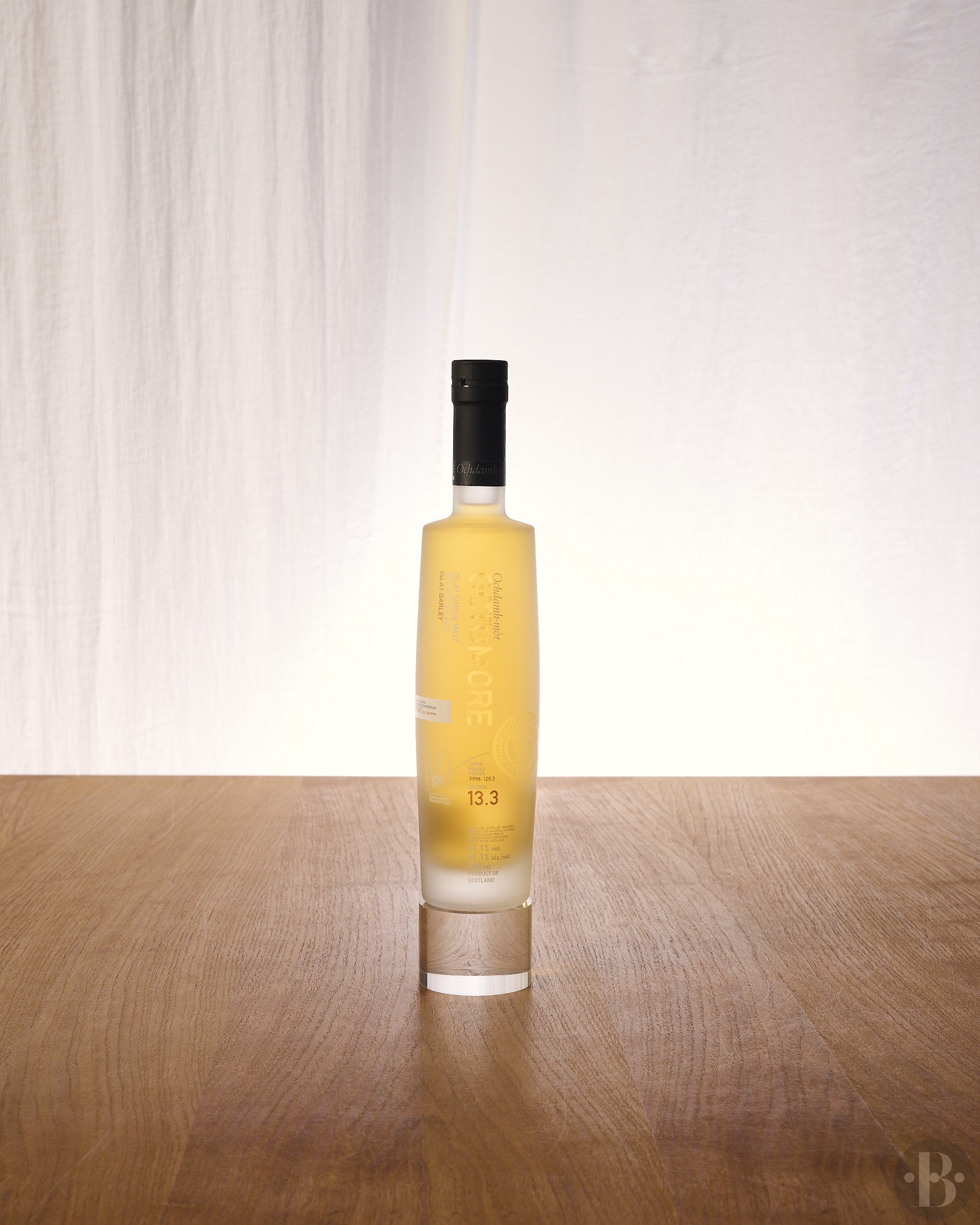 One of the three super heavily peated series 13. 5 years old. Distilled in 2016 from the 2015 harvest of 100% Octomore Farm-grown Concerto barley. Peated to 129.3ppm of phenols. Matured in a foundational parcel of first-fill ex-American whiskey barrels and a supplementary selection of second-fill European oak casks, hailing from the Rivesaltes region of France and the Ribera del Duero region of Spain.