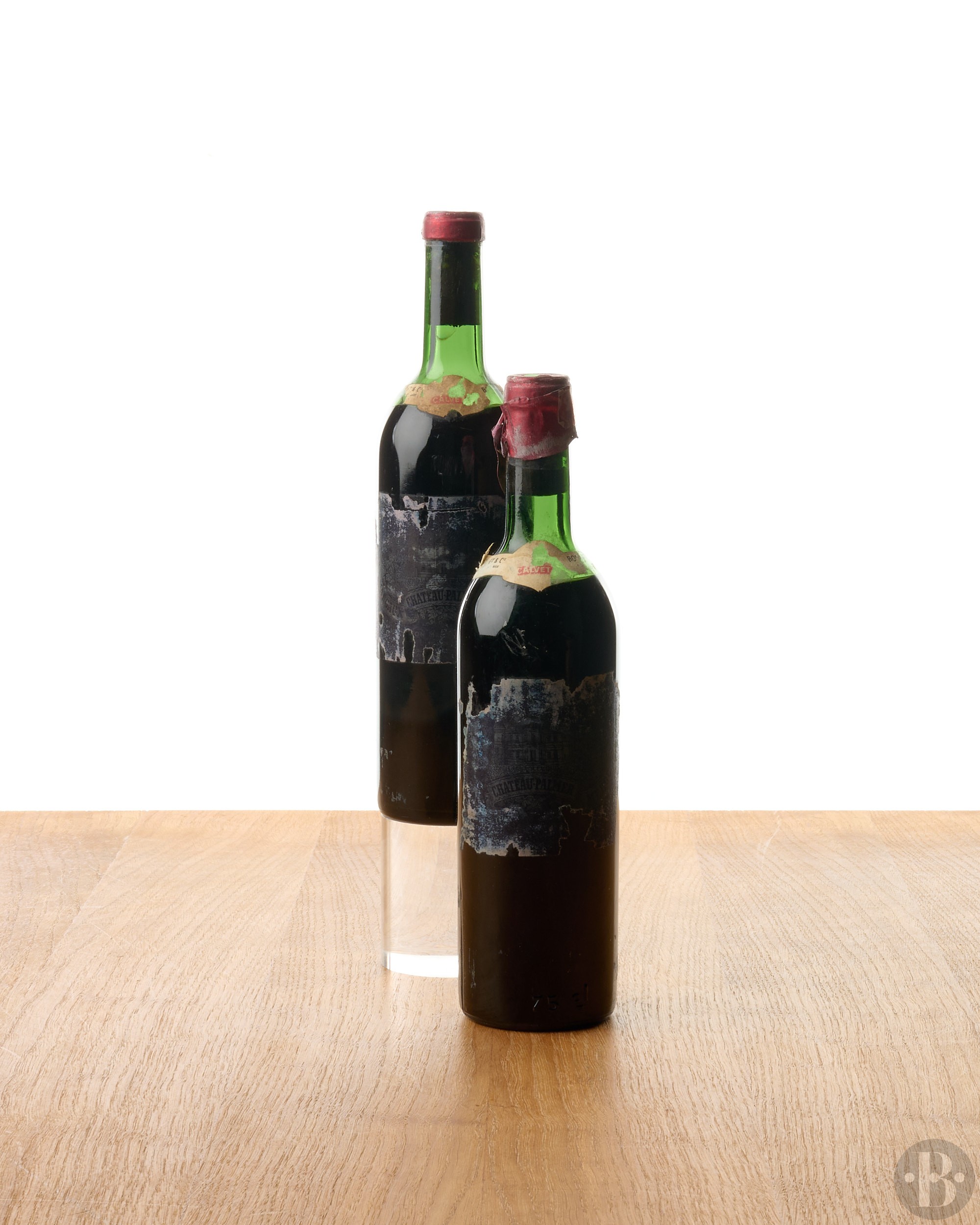 Capsules coupées pour inspection. Millésime imprimé sur les bouchons. Étiquettes Calvet. Étiquettes abîmées. Niveaux en haut de l'épaule.