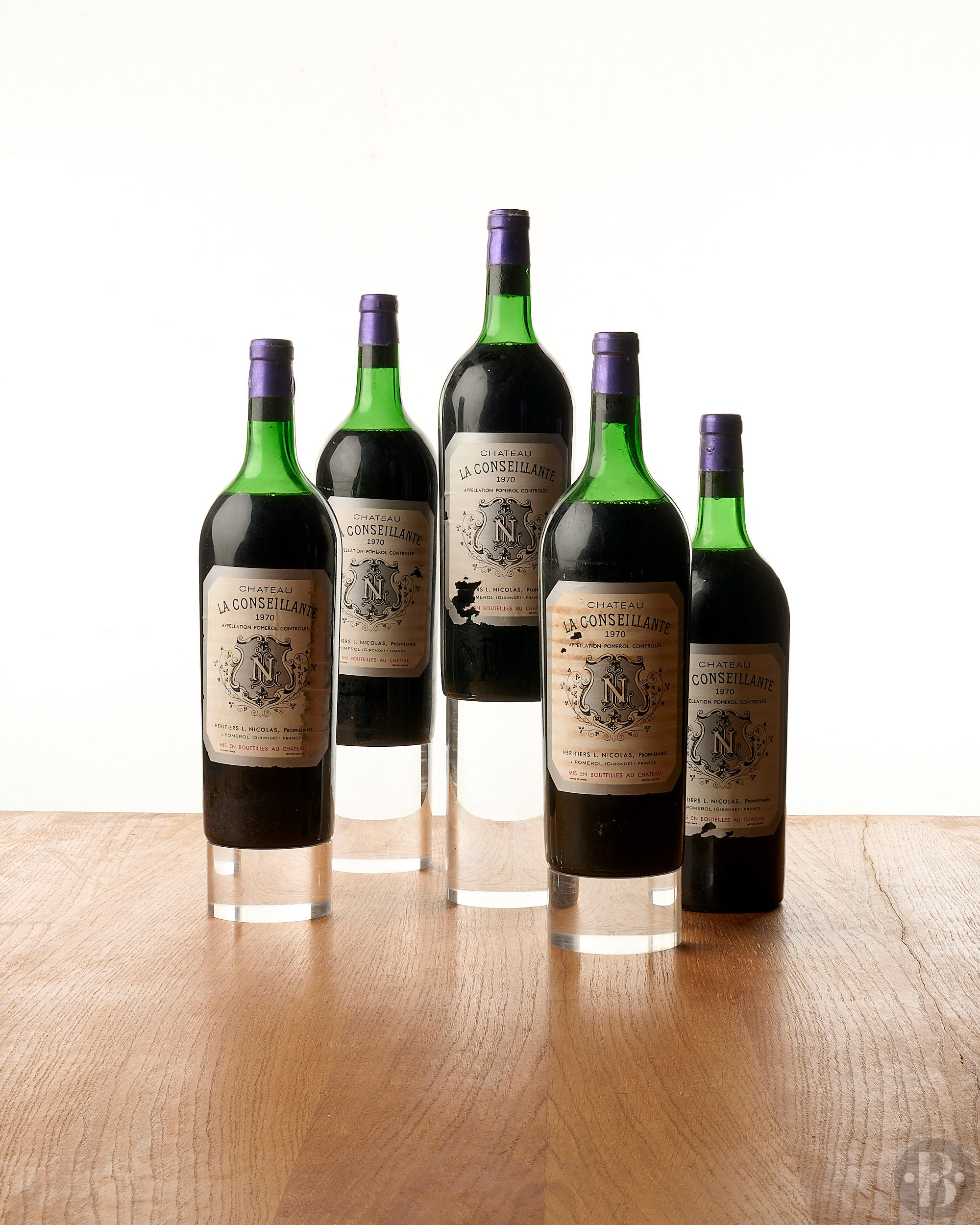 Capsules corrodées dont une sévèrement endommagée. Étiquettes tachées d'humidité, marquées et griffées. Niveaux: deux en haut de l'épaule et trois épaule haute.