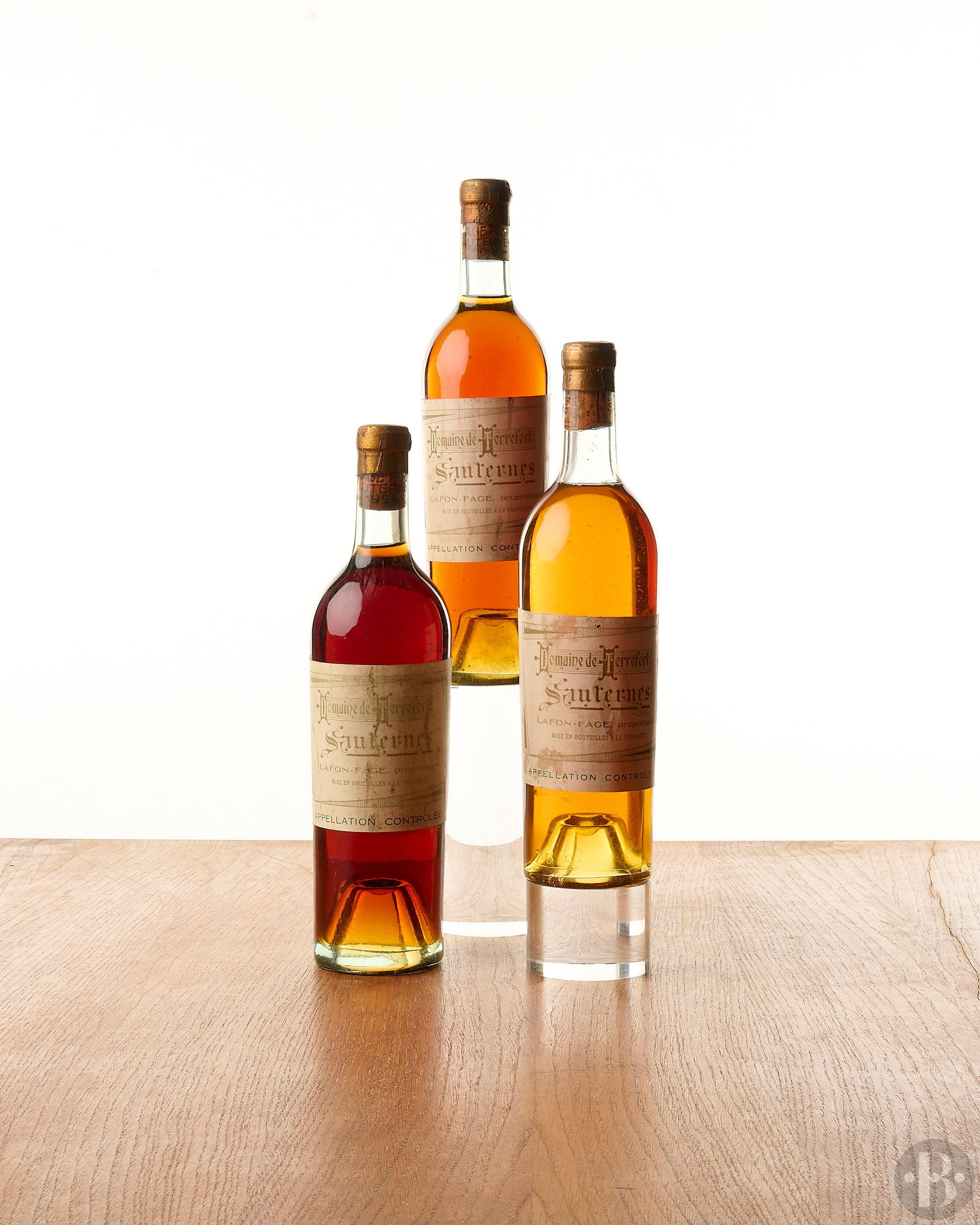 Capsules corrodées. Une capsule griffée. Millésime imprimé sur les bouchons. Étiquettes tachées et marquées. Niveaux: deux dans le col et une tout en haut de l'épaule.