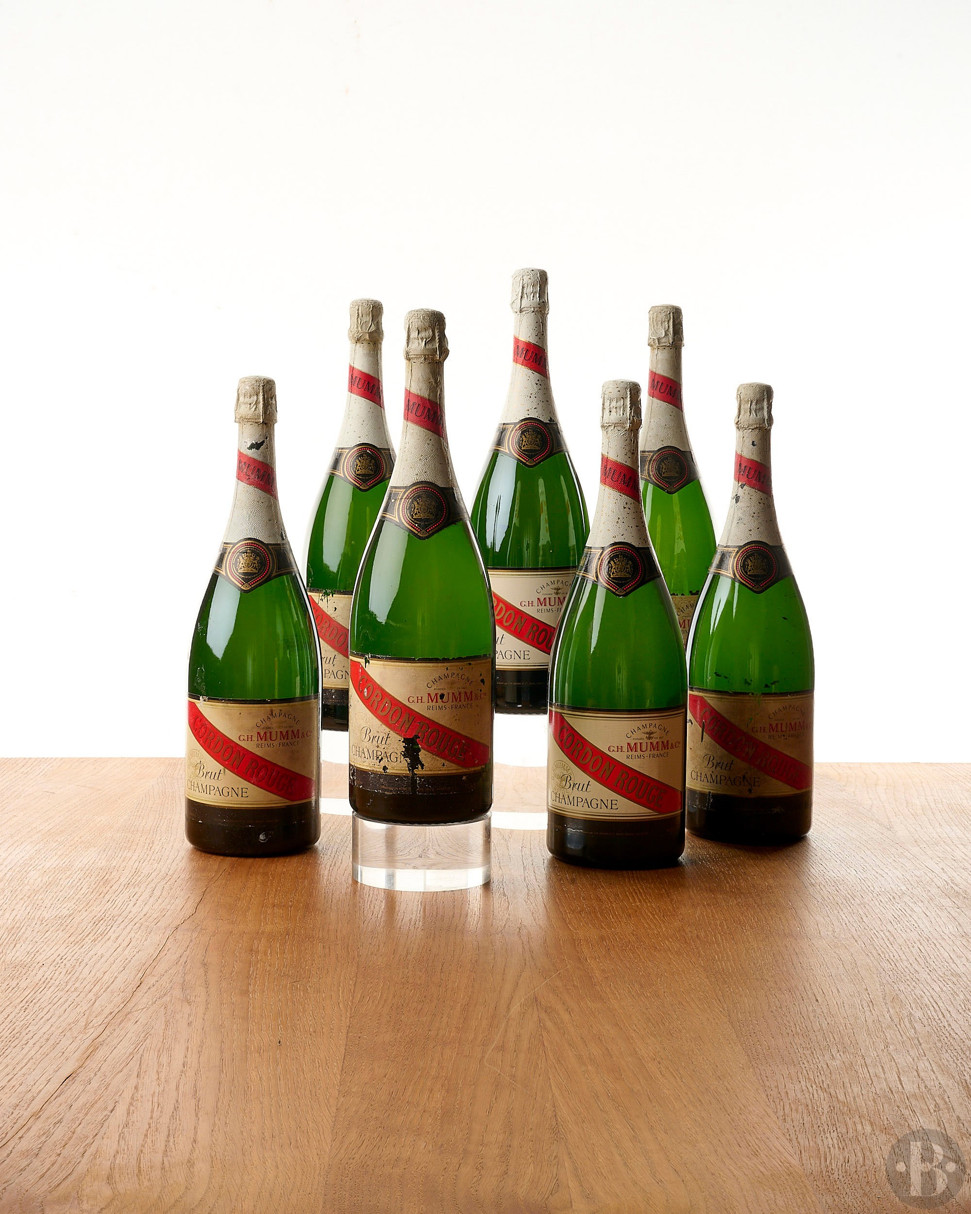Capsules et colerettes tachées. Étiquettes endommagées.