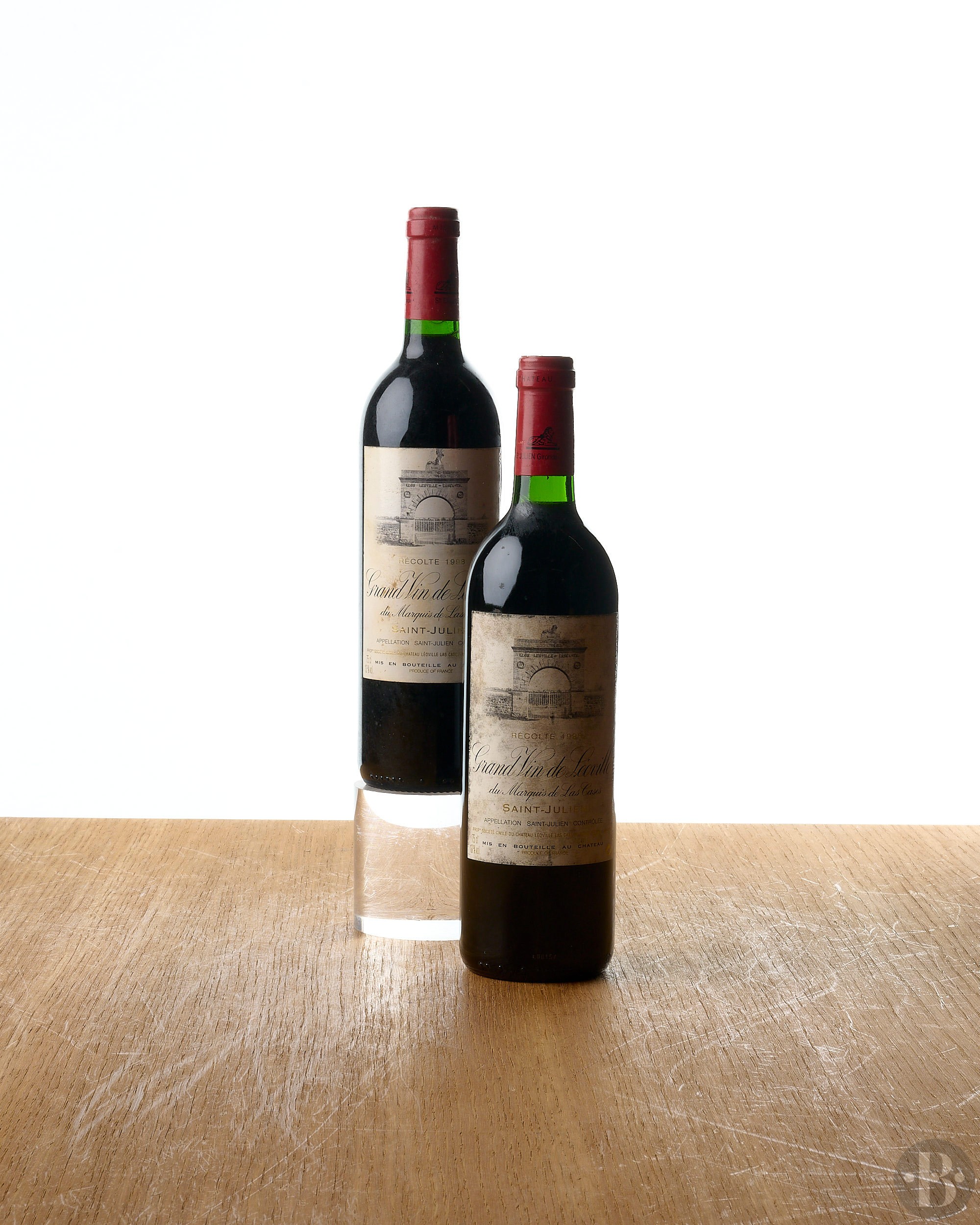 Bouchons légèrement enfoncés. Étiquettes tachées, salies et griffées. Niveaux: un à la base du col et un dans le col.