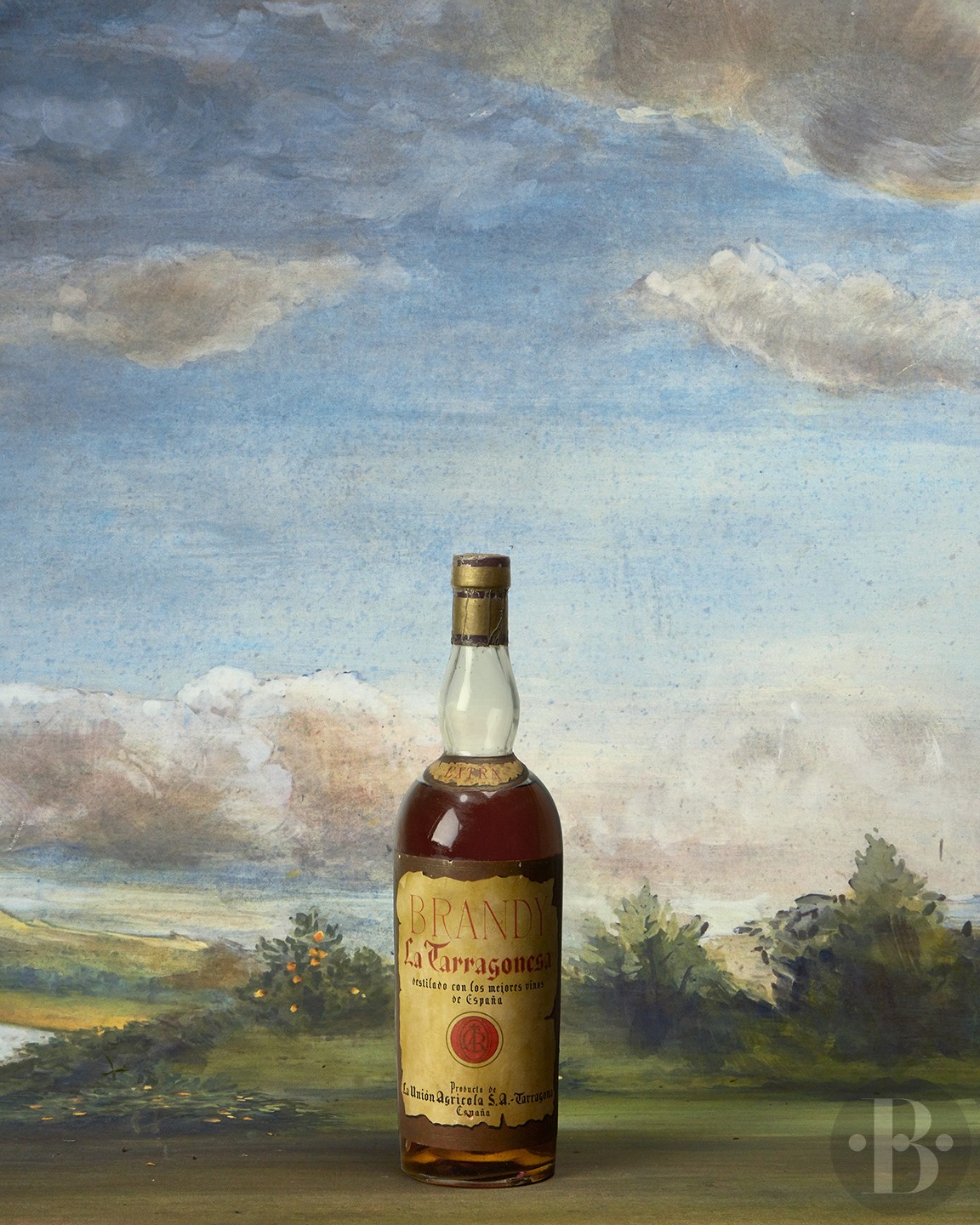 Good red and gold metal capsule. Good cork. Bin-soiled and nicked label. Level at 7cms below base of capsule.