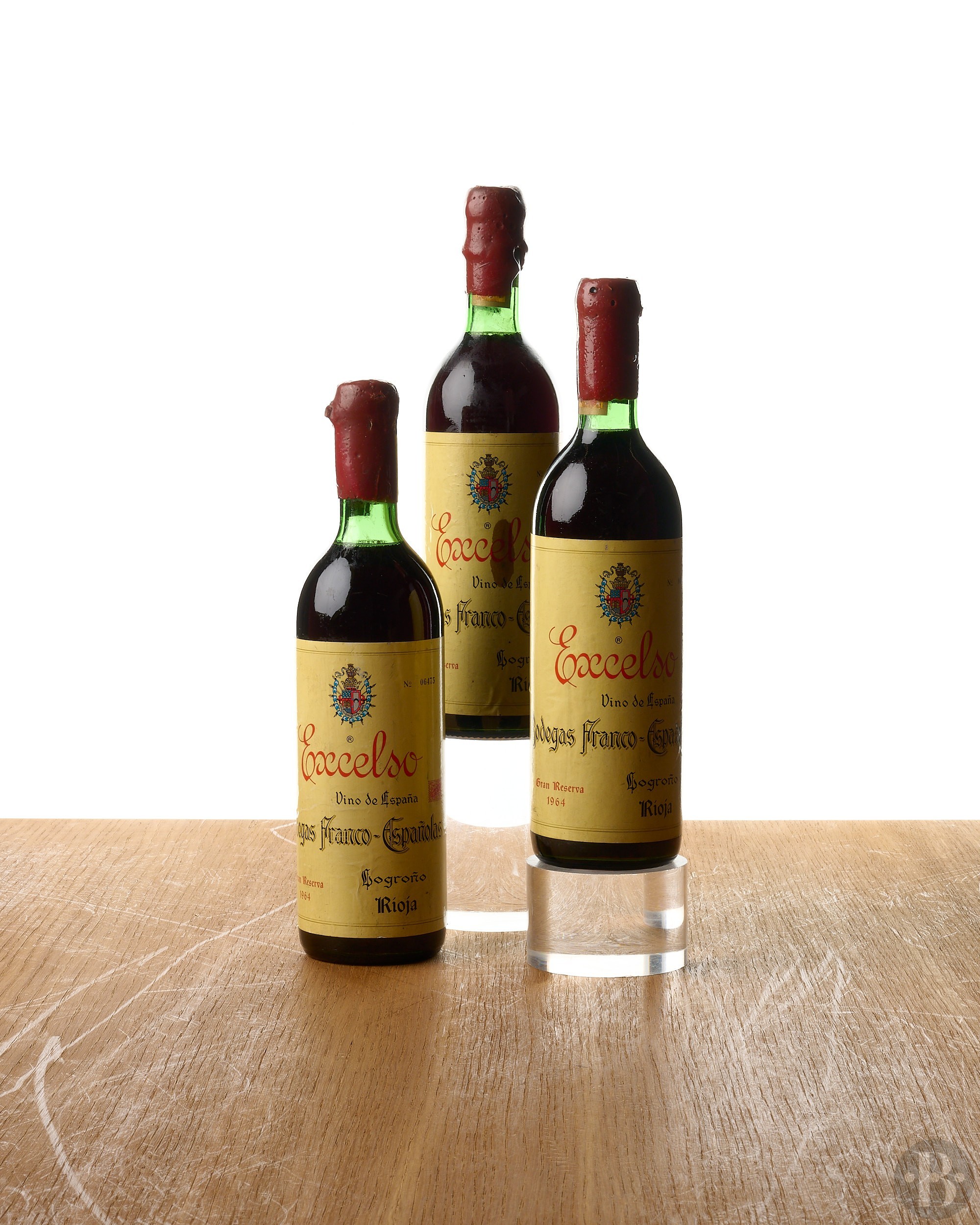 Damaged wax capsules. Marked and stained labels. Levels: two at base of neck and one at top-shoulder.