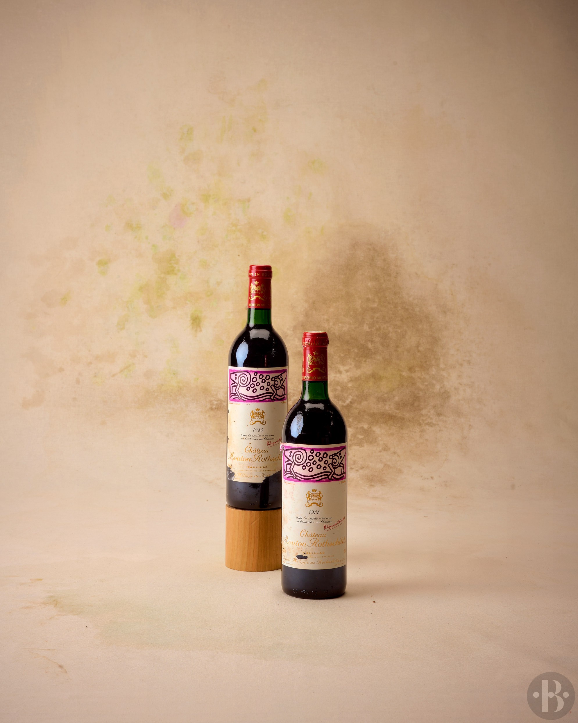 Capsules en bon état, une légèrement gonflée. Etiquettes tachées par l'humidité, griffées, déchirées sur les bords et marquées. Niveaux : une base du goulot et une dans le goulot.